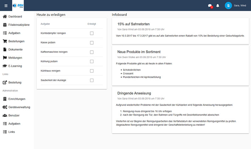Entdecken Sie das neueste Produkt der BBN-Produktfamilie: Mit BBN-Connect verbessern Sie die Kommunikation auf allen Ebenen und profitieren von wirkungsvollem Aufgaben-, Termin- und Hygiene-Management. Dank eines ganz neuen Meldesystems bleiben Sie immer über alles Wichtige in Ihrem Unternehmen auf dem Laufenden. Mit BBN-Connect setzen Sie auf ein vollwertiges Mitglied der BBN-Produktfamilie. Sie vernetzen damit spielend einfach alle organisatorischen Bereiche Ihres Betriebs. Online, nachvollziehbar und wirkungsvoll. Versprochen!